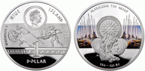 В центре аверса монеты – декоративный мотив из вазовой живописи эпохи Александра Великого с изображениями сражающихся воинов-гоплитов. Вверху, в декоративном обрамлении (греческий орнамент) – портрет Её Величества Королевы Елизаветы II и фирменный знак монетного двора (m/w). По бокам – название эмитента: NIUE ISLAND (Остров Ниуэ). Внизу – номинал: 1 DOLLAR (1 доллар).