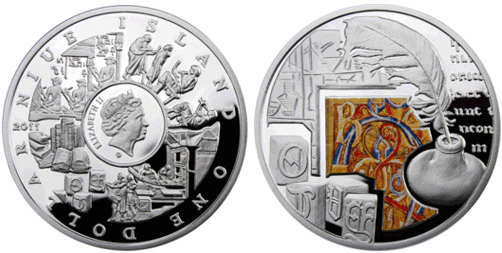 В центре аверса – портрет Её Величества Королевы Елизаветы II, надпись «ELIZABETH II» и фирменный знак монетного двора (m/w). Вокруг портрета расположены сцены, представляющие историю развития письменности на протяжении веков. Вверху, слева – иероглифическое письмо, сложившееся в древнем Египте. Дальше – римские писцы с писарскими принадлежностями и восковыми табличками. Внизу, справа – первый печатный пресс, и его изобретитель – Иоганн Гутенберг, контролирующий печать. Слева – изображения металлических литер, а также манускриптов и книг. Вдоль края монеты – название эмитента: NIUE ISLAND (Остров Ниуэ), год выпуска (2011) и номинал: 1 DOLLAR (1 доллар).