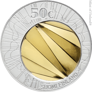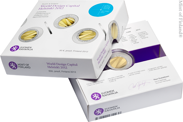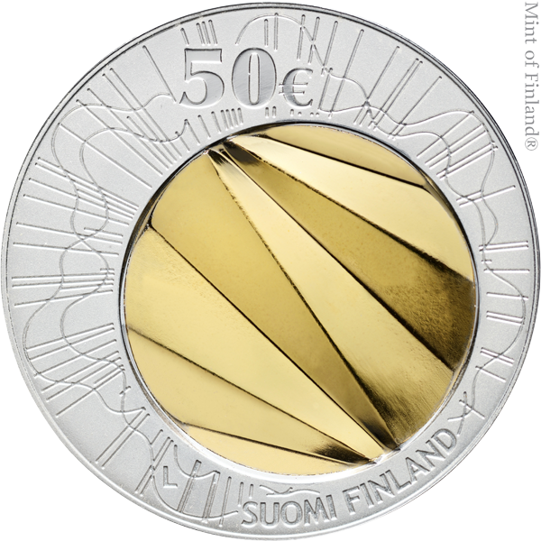 Монетный двор Финляндии отмечает этот особый год для финского дизайна чеканкой золотой и серебряной коллекционной монеты номиналом 50 евро, а также монетой из недрагоценного сплава номиналом 5 евро.