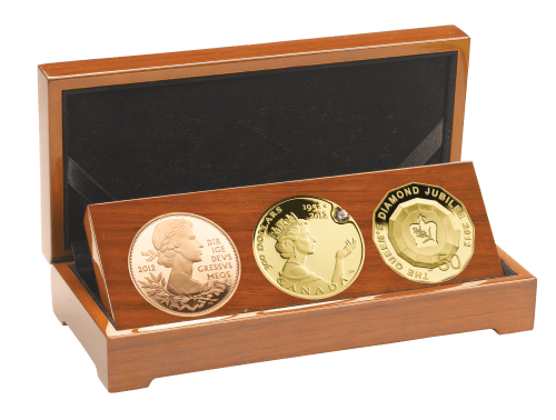Набор золотых монет объединяет 50-центовую монету из Австралии, 300-долларовую монету из Канады и британскую пятифунтовую монету. Все они отчеканены качеством “пруф” и имеют особый дизайн, созданный специально в честь Бриллиантового юбилея.