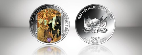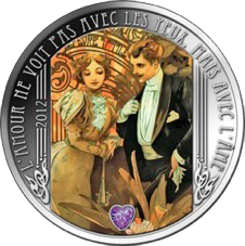Любовью наполнена эта новая серебряная монета. На ней и мотив картины чешского художника Альфонса Марии Мухи “Флирт” (создана в 1899 году для обложки календаря), и цитата Вильяма Шекспира “Любовь смотрит не глазами, а сердцем” на французском – языке любви! – и, конечно, гранёный в форме сердца великолепный аметист!