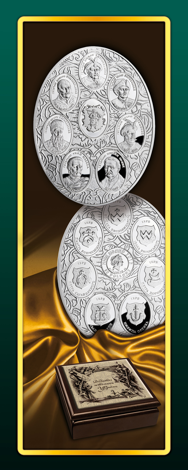 Богдан Хмельницкий, Иван Выговский, Петро Дорошенко, Пилип Орлик, Иван Мазепа, Петро Сагайдачный, Дмитро Вишневецкий выдающиеся гетманы Украины на новой монете из чистого серебра 999.9 пробы впервые явилась публике на выставке “Ювелир Экспо Украина“, которая проходит 16-19 мая 2012 года в выставочном центре “Киев Экспо Плаза”.