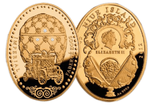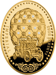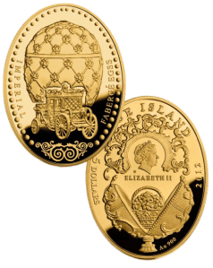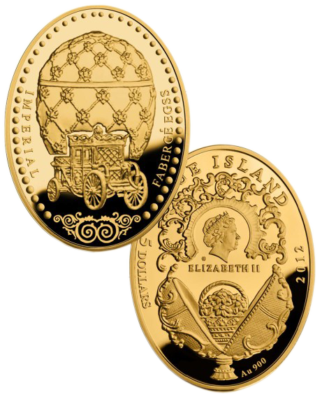 • девять монет в форме эллипса 22.30 х 16.70 мм будут выпущены из золота 900 пробы тиражом по 777 шт. Масса каждой монеты 6 г, номинал 5 долларов, эмитент Остров Ниуе. Качество: пруф. Начинает коллекцию, конечно, “Коронационное яйцо” 🙂 Следом за ним появятся монеты  “Зимнее яйцо”, “Яйцо “Петушок”, “Яйцо “Орден Св.Георгия” и другие.