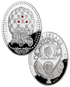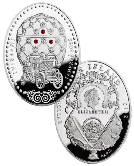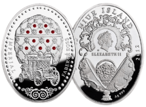 • аккомпанируя золотым 6-граммовым монетам, появятся и серебряные монеты массой 16.81 г с инкрустацией тремя пурпурными кристаллами Swarovski каждая. Номинал 1 доллар, эмитент Остров Ниуе, тираж 9999 шт. Монеты имеют форму эллипса 39 х 29.2 мм. Качество: пруф. Премьера коллекции – “Коронационное яйцо