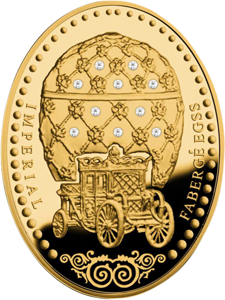 • Коронационное яйцо из золота 999.9 пробы с инкрустацией тремя  бриллиантами: тираж 333 шт., номинал 50 долларов, эмитент Остров Ниуе, масса 31.1 г. Монета имеет форму эллипса 39 х 29.2 мм. Качество: пруф