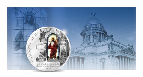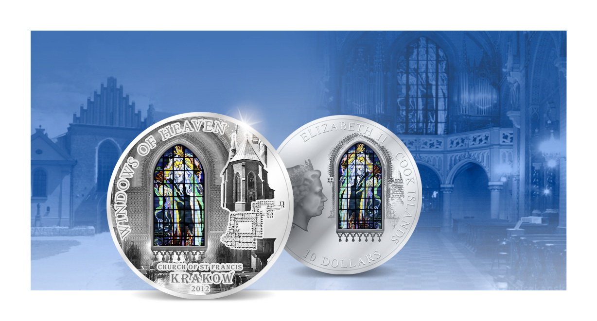 Монеты выполнены из серебра 925 пробы, весят 50 г каждая и имеют 50 мм в диаметре. В монетах этой серии уникальная вставка из стекла воссоздаёт знаменитейший витражный элемент каждого из всемирно известных соборов. Тираж каждой монеты этой серии – 2 000 шт., номинал – 10 долларов. Эмитент этих монет – Острова Кука. Серия начата в 2011 году. Ежегодно в серии “Витражи небесные” появляется три красивейшие монеты.Витраж собора в Севилье, Испания