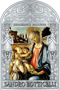 “Мадонна с младенцем и два ангела” кисти Сандро Боттичелли появилась на серебряной монете серии “Мадонны Ренессанса”. Благословенная для всех художников эпоха, связанная с именем Лоренцо Медичи Старшего, Великолепного подарила миру гений Сандро Боттичелли (1445-1510). Один из наиболее ярких  мастеров эпохи Возрождения, он был незнатного происхождения. Творческим и карьерным успехам обязан лишь  собственной энергии, воле, уму и таланту, что вместе с редким обаянием и чувством такта позволило сыну кожевника войти в самый избранный круг утонченнейшей культурно-творческой элиты Европы.