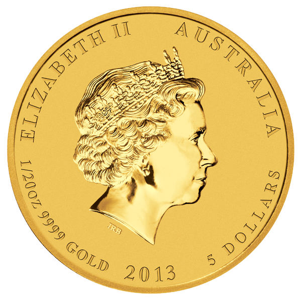 Из чистого золота (проба 999.9) Пертский Монетный двор отчеканит 8 видов инвестиционных монет к Году Змеи: от 1.5-граммовой (1/20 тройской унции) до 10-килограммовой. Тираж их также изначально не ограничен, только для 10-килограммовой и унцевой золотых Змей ограничено максимальное количество монет: их будет выпущено не больше 100 и 30 000 штук соответственно. Как и серебряная, 10-килограммовая монета к Году Змеи будет выпущена исключительно на основе заказов клиентов и дистрибьюторов, но не позже 31 декабря 2013 года, когда Монетный двор г.Перт объявит фактический тираж монеты. Чеканить унцевую золотую инвестиционную Змею будут до достижения тиража в 30 000 штук либо до окончания производства серии “Лунный Календарь – II”, в зависимости от того, какое из этих событий наступит первым.