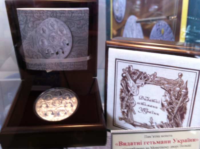 И, конечно, в центре экспозиции – серебряная монета “Выдающиеся гетманы Украины“, отчеканенная Монетным двором Польши из 250 г серебра 999 пробы тиражом 400 шт.