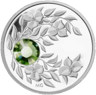 Желаю счастья именинникам августа – для вас серебряная монета, украшенная кристаллом “Перидот“, приносящим удачу и дарующим защиту.
