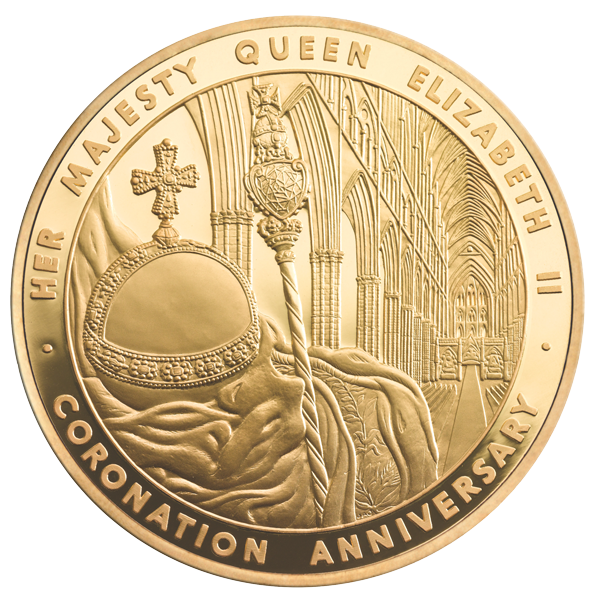 На 5-унцевых монетах Джонатан Оллифф (Jonathan Olliffe) изобразил уходящие вглубь готические арочные своды — интерьер Вестминстерского аббатства, в котором много веков проводятся торжества коронации британских монархов. На переднем плане реверса монеты расположены скипетр и держава, используемые в церемонии. Символ имперской власти — держава — увенчана крестом и символизирует роль монарха как защитника веры. Её поверхность разделена лентами из драгоценных камней и жемчуга на три части, именно столько континентов были известны в средневековой Европе. Скипетр воплощает всемирную власть и украшен 530-каратным бриллиантом “Первая звезда Африки”. Оба исторических атрибута коронационной церемонии окружены королевской мантией, расшитой символикой Королевы. И всё же, взгляд зрителя следует в глубину собора Вестминстерского аббатства, прекрасного свидетеля исторических торжеств британской истории…