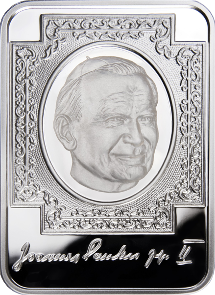 7. Монеты в форме Польши с инкрустацией бриллиантами названы “Иоанн Павел II Максимус“. Серебряная монета весит 100 тройских унций (более 3 кг!), золотая весит 12 тройских унций (373 г). На монетах по 27 бриллиантов — это число, в соответствии с Библией, символизирующее неудержимую волю, смелость и силу духа. 27 лет Иоанн Павел II служил миру в качестве Папы Римского.