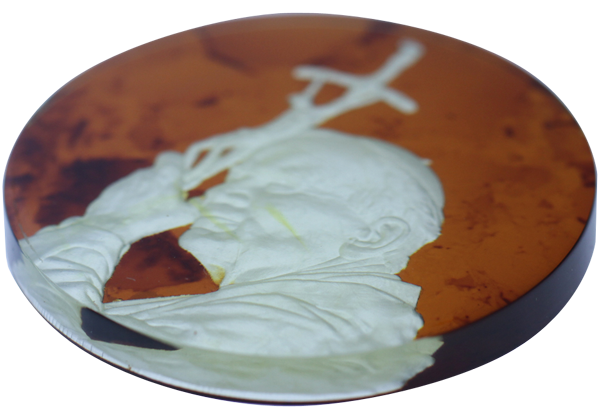 На крышке деревянного футляра к этой монете золотом нанесено изображение папского герба и надпись на польском языке “Святой среди святых“.