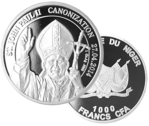 митентом монеты, на которой Иоанн Павел II благословляет мир, стало государство Нигер. Номинал монеты 1000 нигерийских франков.