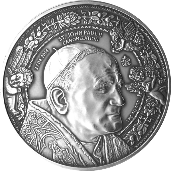 3. Самая массивная монета в честь канонизации Иоанна Павла II весит 4 килограмма. Монета названа “Святой среди святых” — на ней Иоанн Павел II окружён изображениями святых: