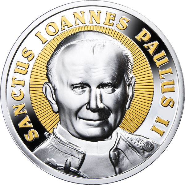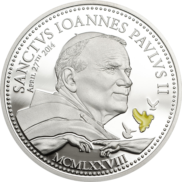 Канонизации 27 апреля 2014 года обоих понтификов посвящены две монеты из серебра 925 пробы, на которых в технике перегородчатой эмали выделено цветом изображение голубя, воплощение Святого Духа. Жёлтой эмалью он отмечен на монете в честь Иоанна Павла II и белой — в честь Иоанна ХХIII.
