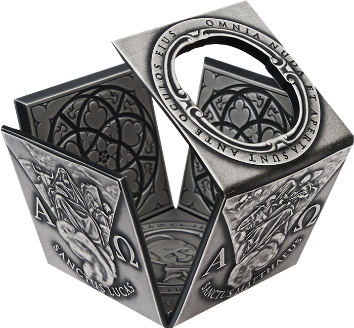 Грани монеты-куба изнутри украшены традиционным орнаментом витражных розеток, которыми принято оформлять оконные проёмы в католических храмах. Снаружи на боковых гранях монеты-куба изображены апостолы Лука, Марк, Иоанн и Матфей, восседающие на облаках.