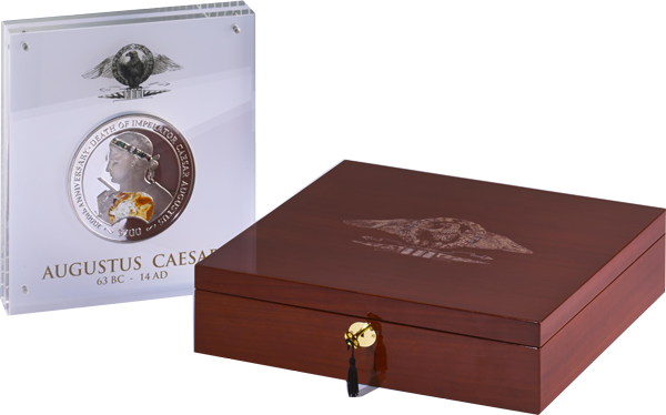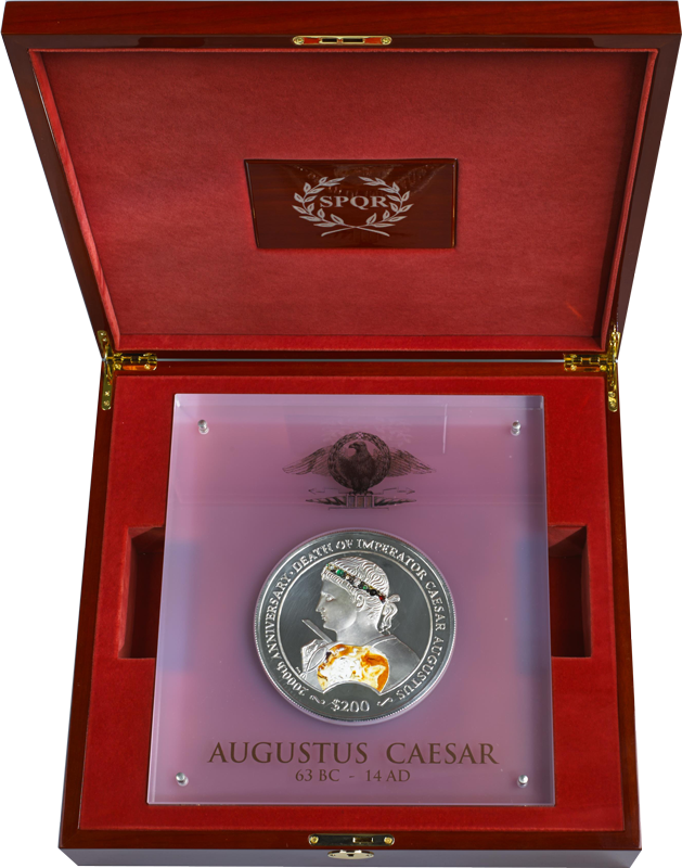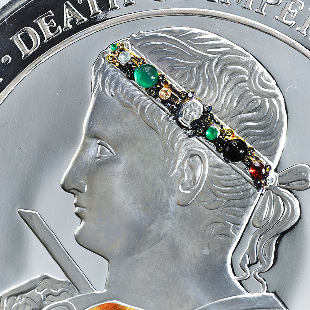 Сильный молодой воин, которым Август изображён на камее, отчеканен на этой массивной серебряной монете, тираж которой всего 50 экземпляров.
