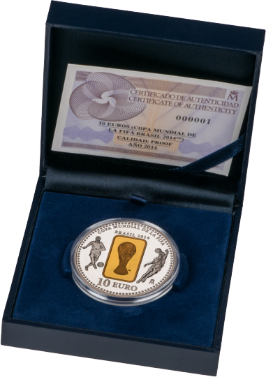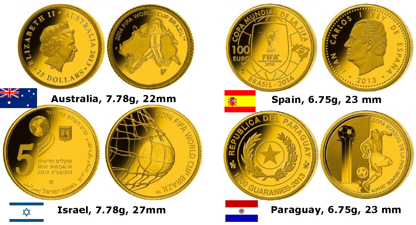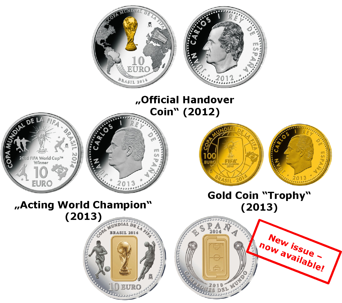 Первые монеты Чемпионата мира FIFA 2014 отчеканили в Мадриде: чемпионы мира и Европы получили это право после предыдущего Чемпионата. Королевский монетный двор Испании отметил триумф национальной сборной по футболу монетами из золота и серебра в 2012 – 2014 годах: