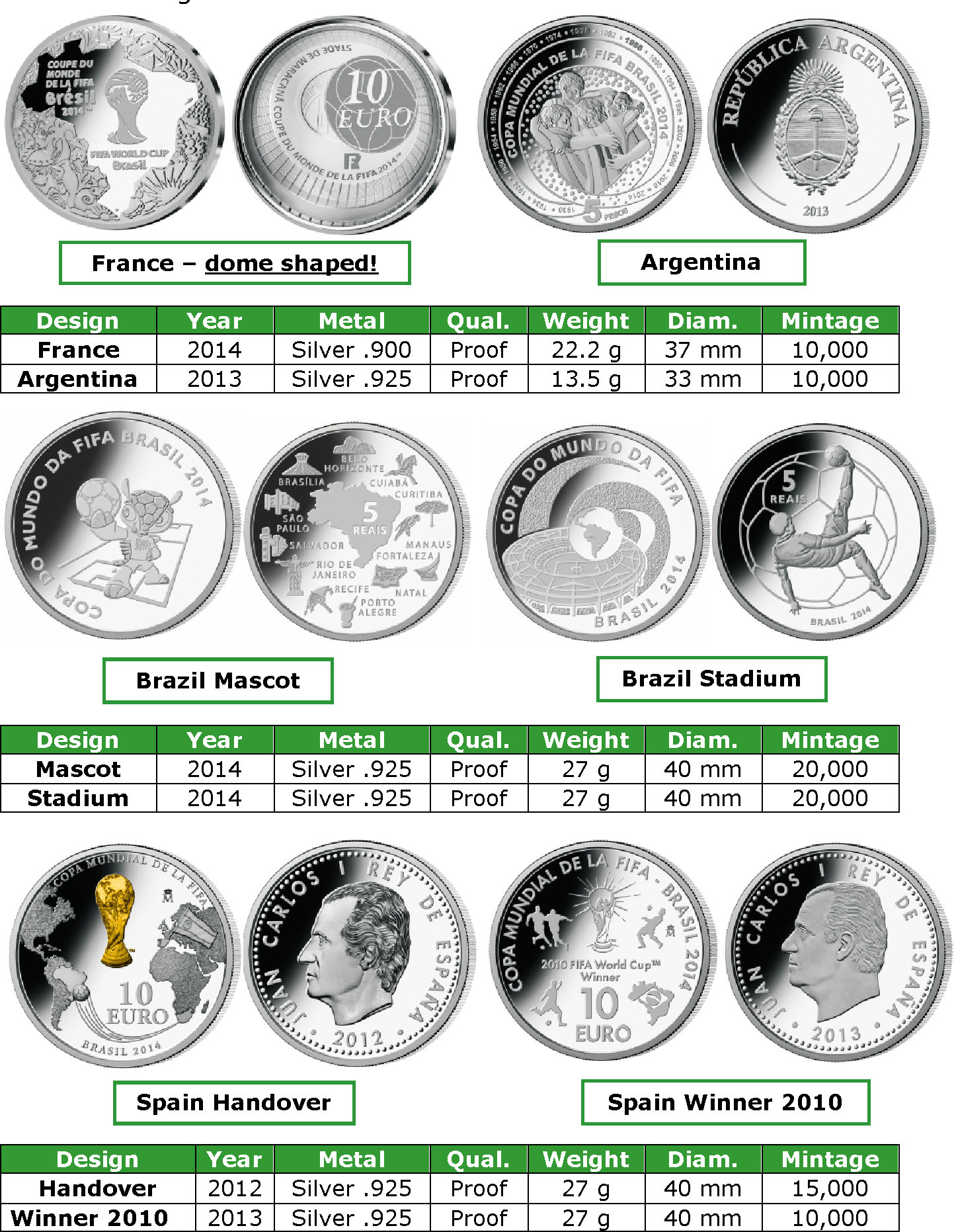 Монеты к Чемпионату мира по футболу 2014 в Бразилии — драгоценные посланники разных стран на празднике самого популярного спорта на планете. Официально одобренные FIFA золотые и серебряные монеты и медали со всего мира составили вдохновляющую коллекцию:Золотые и серебряные монеты FIFA-WC-2014