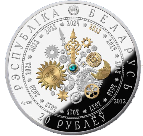 Замечательно выполнен аверс монет этой серии — щедро декорированное символикой судьбы и времени изображение циферблата часов будут чеканить на монетах до 2024 года. Описание серебряной монеты “Год Лошади 2014” с позолотой и кристаллом можно скачать здесь.