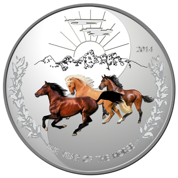 Одним из первых дизайнов монет к Году Коня, представленных в прошлом году на ярмарке в Берлине, и одной из первых монет, отчеканенных в канун 2014 года стала “Тройка лошадей – Инь Янь“, созданная компанией “Сокровищница Страны Оз” (Treasures of Oz) из Австралии и Монетным двором Майера из Германии. Монета массой 31.1 г вышла в двух версиях: диаметром 65 мм и 38.61 мм.