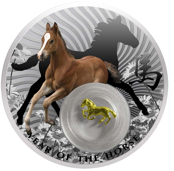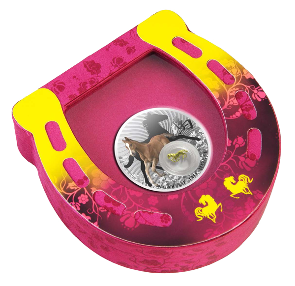 ♥ серебряная монета “Год Коня” с тампопечатью и позолоченной лошадкой внутри монеты, в футляре-подкове. Скачать иллюстированный постер об этой монете можно здесь.