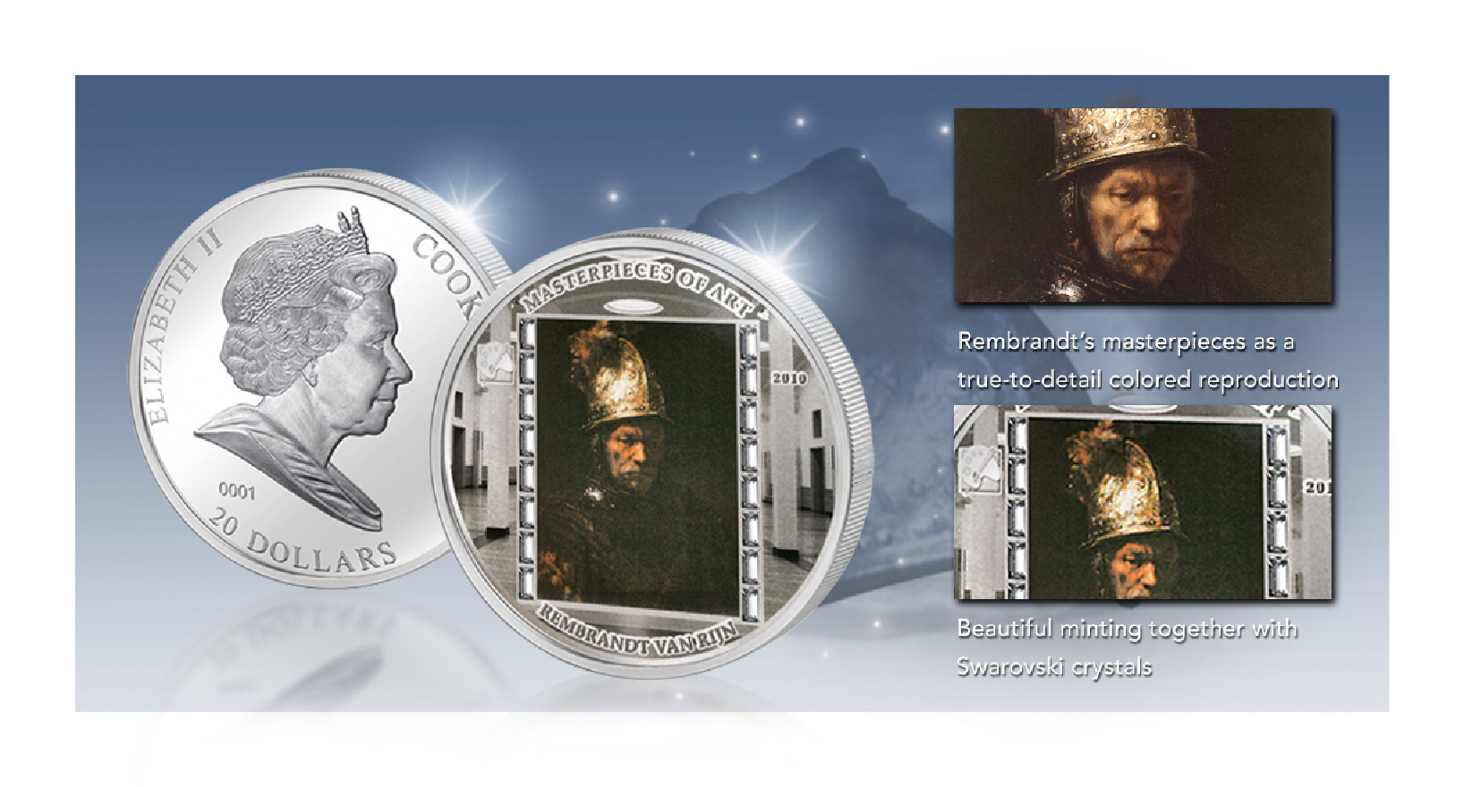Ещё одна картина Ван Гога, “Звёздная ночь” (уже знакомая нумизматам по прямоугольной монете серии “Художники мира“, отчеканенной в 2007 году Монетным двором Польши и быстро ставшей раритетом на монетном рынке), появилась в 2015 году на серебряных монетах. Она продолжила серию “Шедевры искусства” трёхунцовых серебряных монет, для которых характерна рамка из прямоугольных кристаллов Swarovski вокруг картины. Тираж монеты традиционно для этой серии соответствует году написания картины — 1889. Диаметр монеты 55 мм, её номинал равен 20 новозеландским долларам, эмитент — Острова Кука. Проба серебра 999.