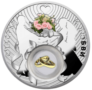 Соединённые обручальные кольца символизируют неразрывный союз, а их поверхность покрыта 24-каратным золотом. Кольца свободно перемещаются внутри прозрачной капсулы в нижней части монеты.