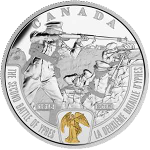 Серебряная монета с позолотой – вторая в серии. 22 апреля 1915 года под бельгийским городом Ипр планировалось первое масштабное сражение с участием Первого канадского дивизиона. Но этот день вошёл в историю иначе – впервые на поле боя противник применил широкомасштабную газовую атаку. Среди ужасов атаки газообразным хлором войск союзников под Ипром (впоследствии этот газ получил название “иприт”), канадцы проявили мужество и самоотверженность. В тот день канадцы как нация обрели репутацию “выкованных из железа”…
